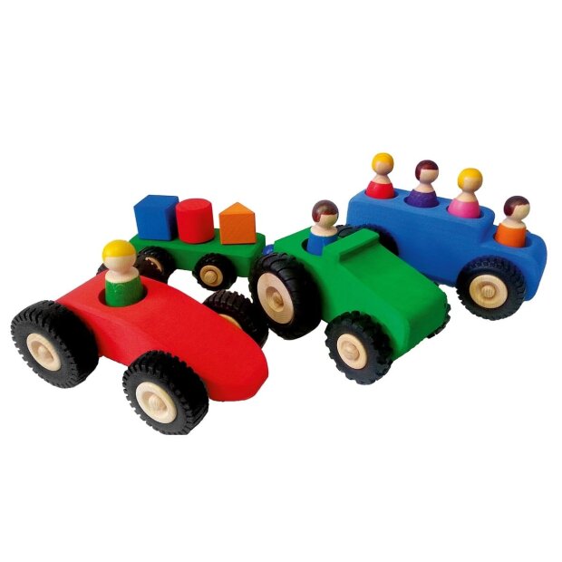 - Der grüne Traktor mit Anhänger transportiert die abnehmbaren Ladungen spielerisch.