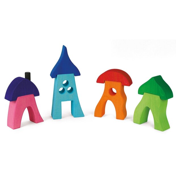 Die fantasievollen Häuser bestehen aus zwei Teilen und begeistern durch ihre variable Dachgestaltung. Sie sind sowohl im praktischen 4er-Set als auch als einzelne Häuser erhältlich. Die massive Bauweise mit einer Dicke von 5 cm sorgt für Stabilität. Mit einer Breite von ca. 13 cm und einer Höhe von 19 bis 28 cm sind sie perfekt für kleine Kinderhände geeignet.