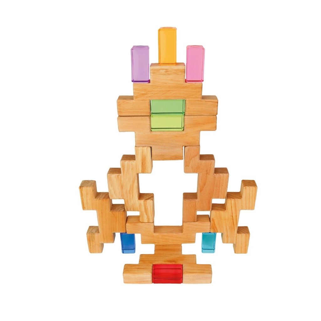 Die Bauspiel Treppenklötze & Lichtbauquader verbinden natürliche Holzoptik mit leuchtenden Farben. Acht naturfarbene Treppenklötze und acht bunte Lichtbauquader laden zum Stapeln, Bauen und Staunen ein. Gemeinsam bilden sie ein vielseitiges Set, das Fantasie, Feinmotorik und räumliches Denken fördert – und jedes Spielzimmer zum Leuchten bringt.