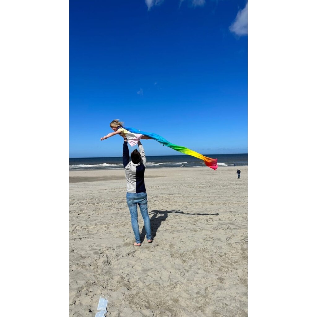 Ben hängt das Spieltuch Regenbogen zwischen zwei Regale. Plötzlich ist es ein riesiger Regenbogenvorhang in seinem Theater. Seine Kuscheltiere warten hinter den bunten Streifen auf ihren Auftritt. Später wird das lange Tuch zur Brücke über einen reißenden Fluss im Wohnzimmer. Manchmal legt Ben es auf den Boden und baut darauf eine Startbahn für seine Flugzeuge. Die weiche Bio-Baumwolle begleitet ihn durch jedes große Abenteuer.