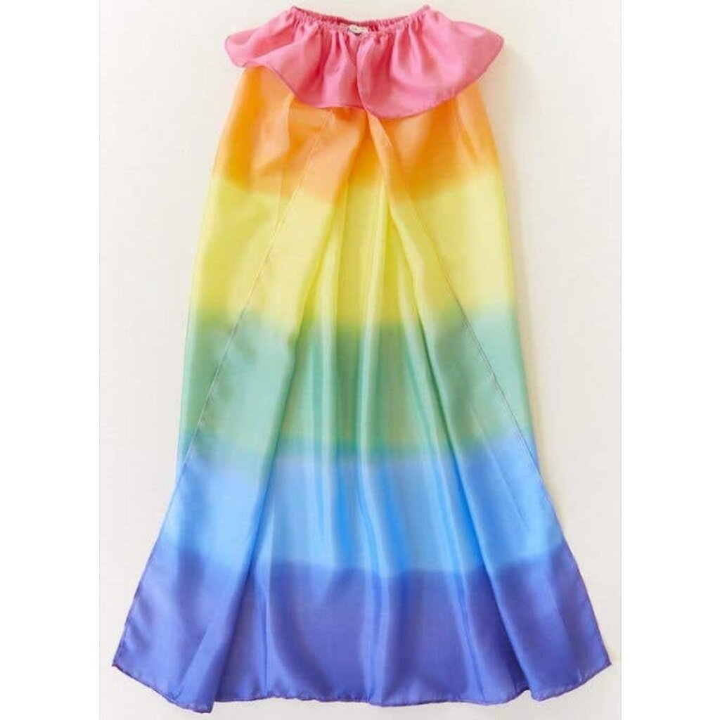 Der Regenbogen Wende-Umhang von Sarah's Silks lässt Kinderherzen höherschlagen. Aus schwerer, hochwertiger Maulbeerseide gefertigt, vereint er leuchtende Regenbogenfarben mit praktischer Wende-Funktion. Das elastische Nackenband und die Bänder zum Zubinden ermöglichen ein kinderleichtes An- und Ausziehen. Seidig weich und dennoch besonders robust – perfekt für stundenlanges fantasievolles Spiel.